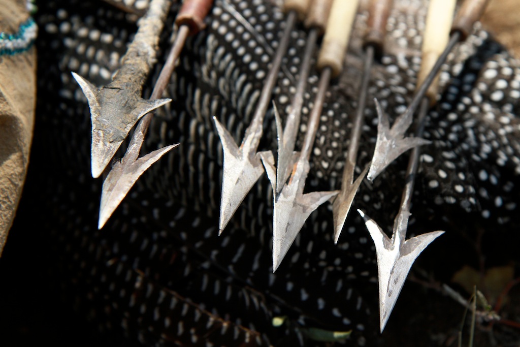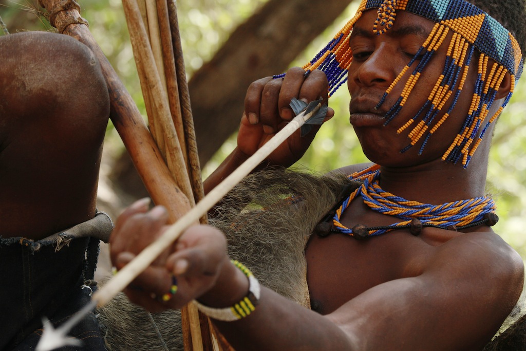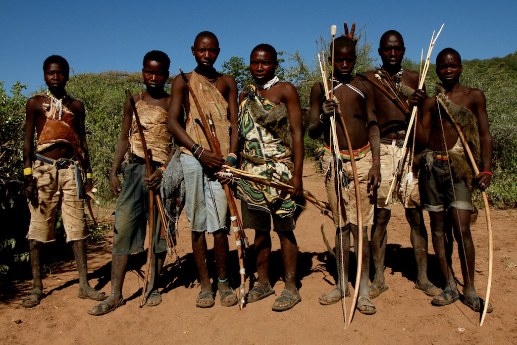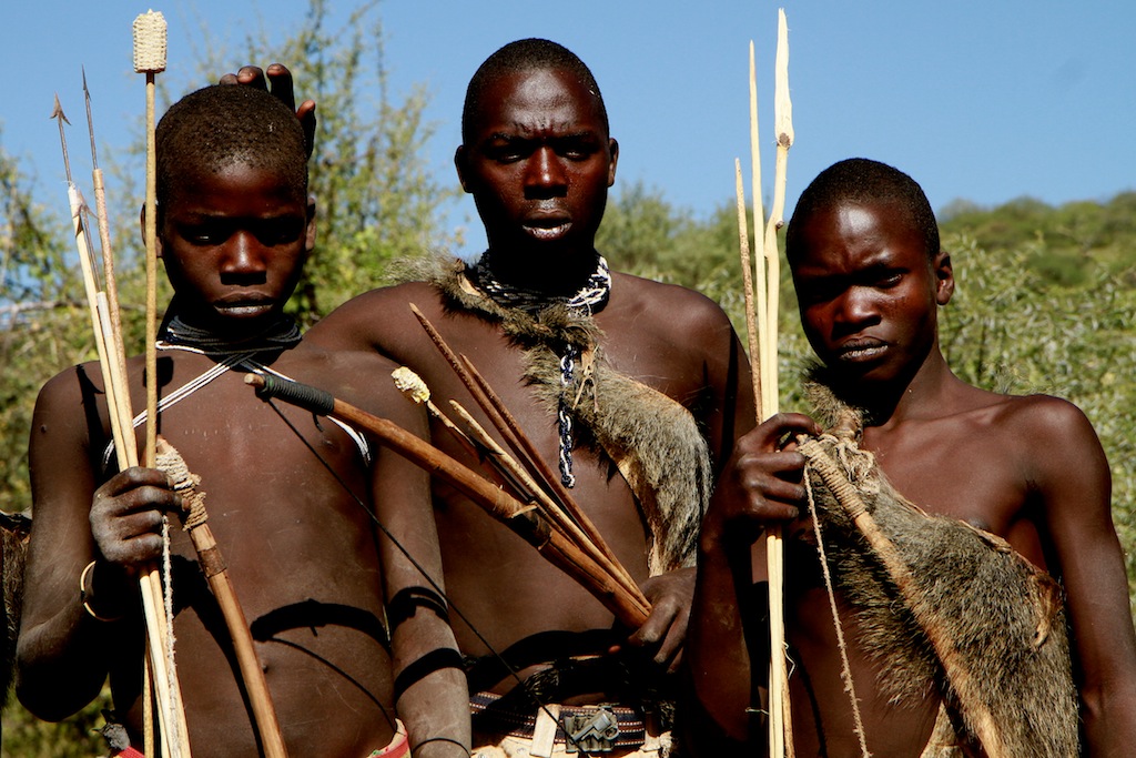 Hadzabe hunters use bows and arrows with different arrowheads depending on the target. Small game such as birds and monkeys is often hunted individually, while larger animals like dik-dik or warthog are hunted collectively in groups. Success in hunting directly influences access to food.